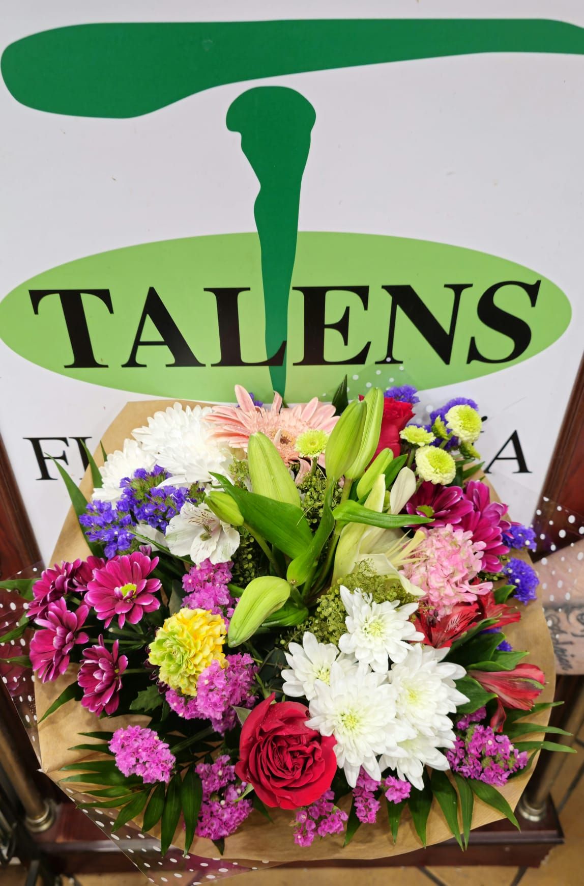 Gerberas, rosas, margarita, lilium y verdes complementarios.