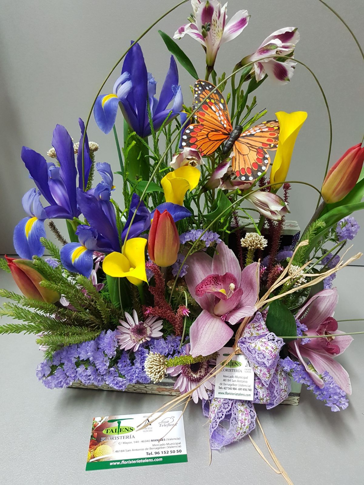 Centro variado con orquídeas, iris, lilium y astromelia.
