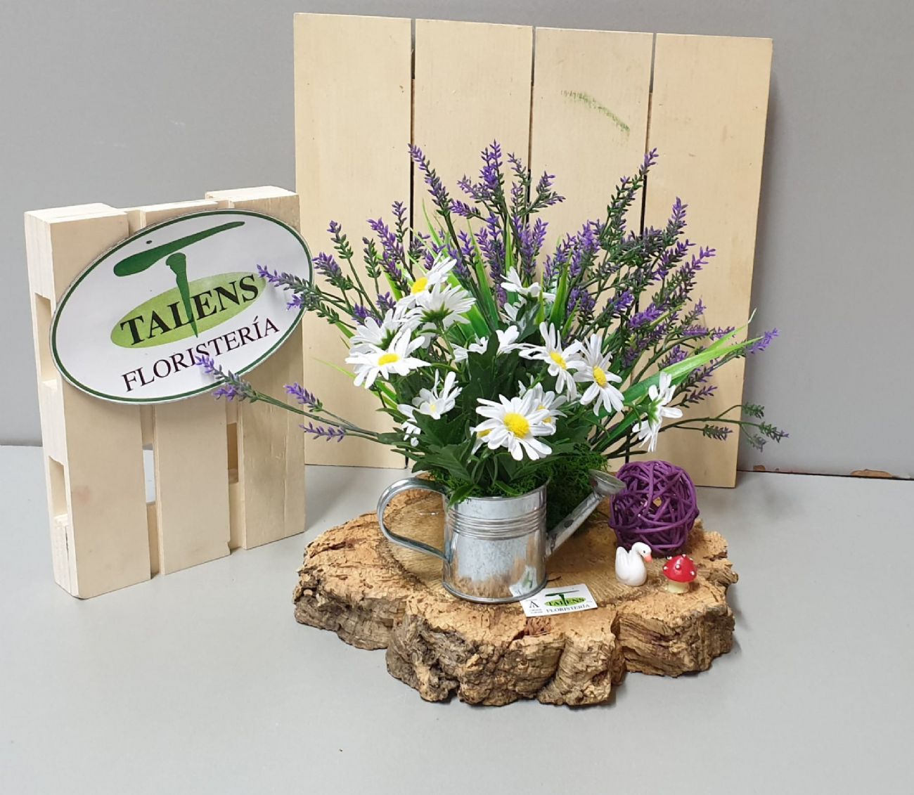 Regadera de zinc con base de tronco Decorado con margaritas y lavanda