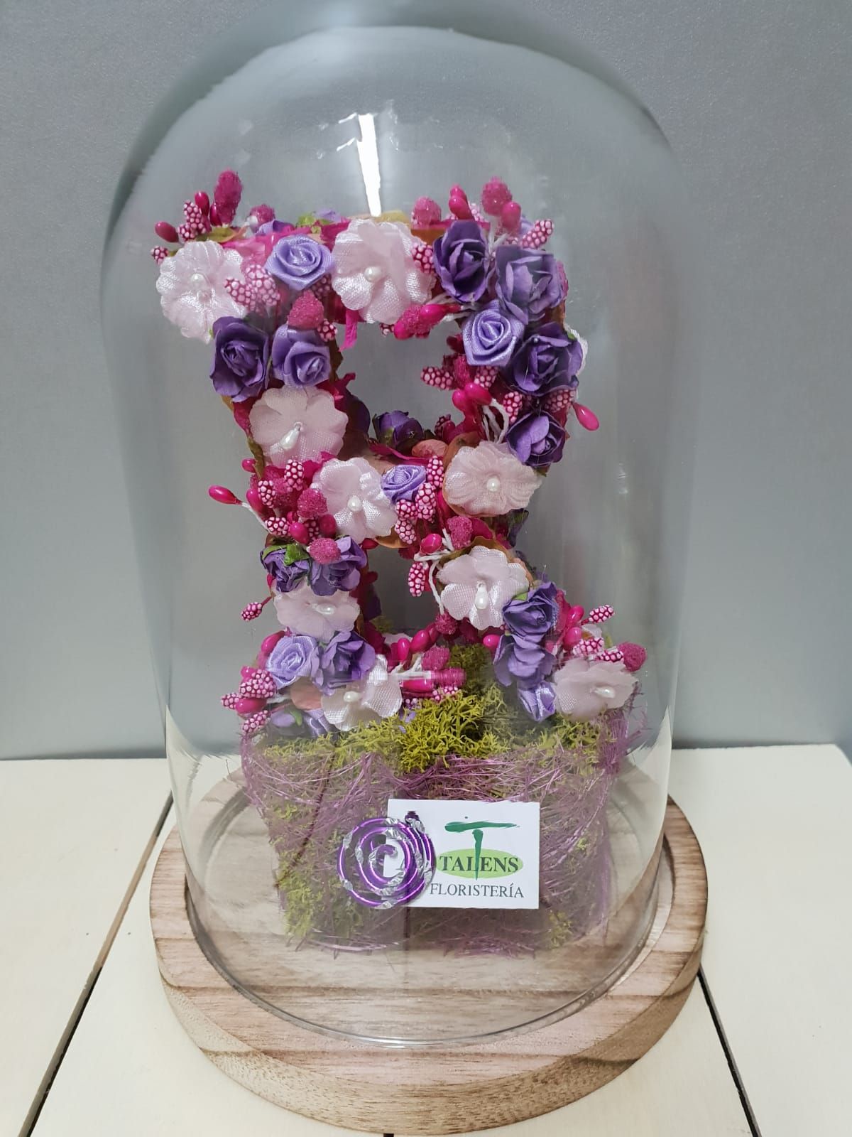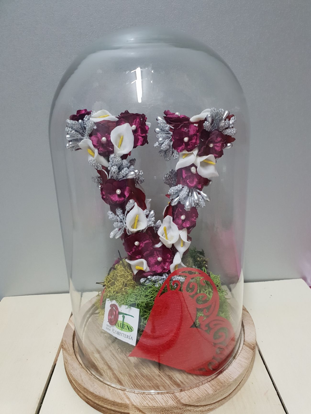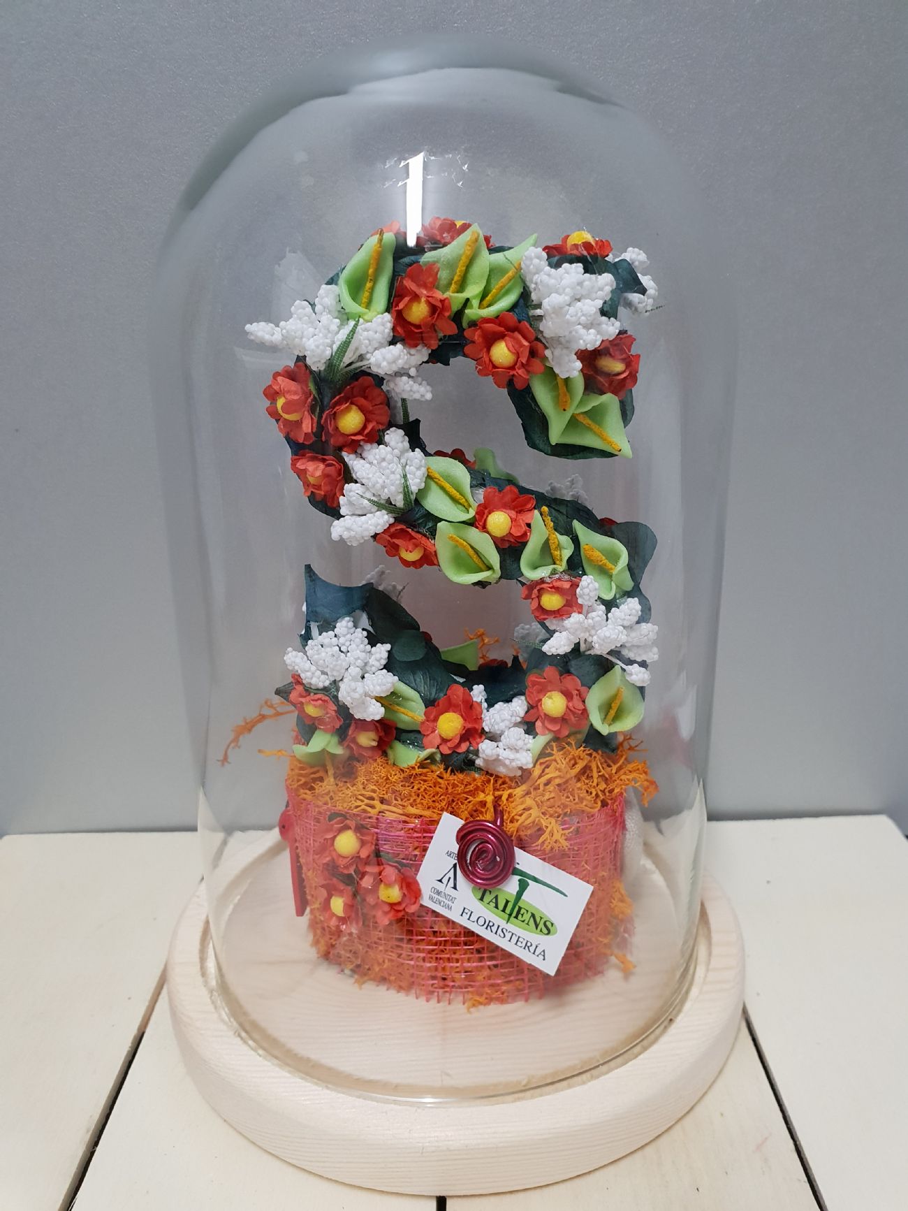Urna decorada con la inicial deseada. Con flores de tela y preservadas, a dos caras. Pedido con una semana de antelación.
