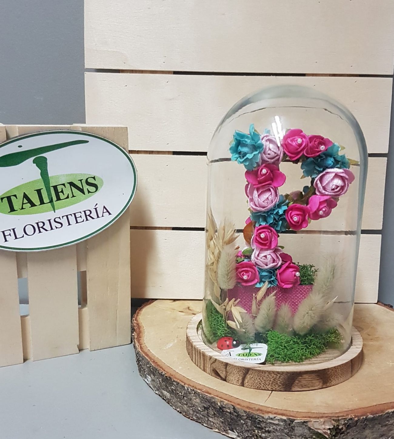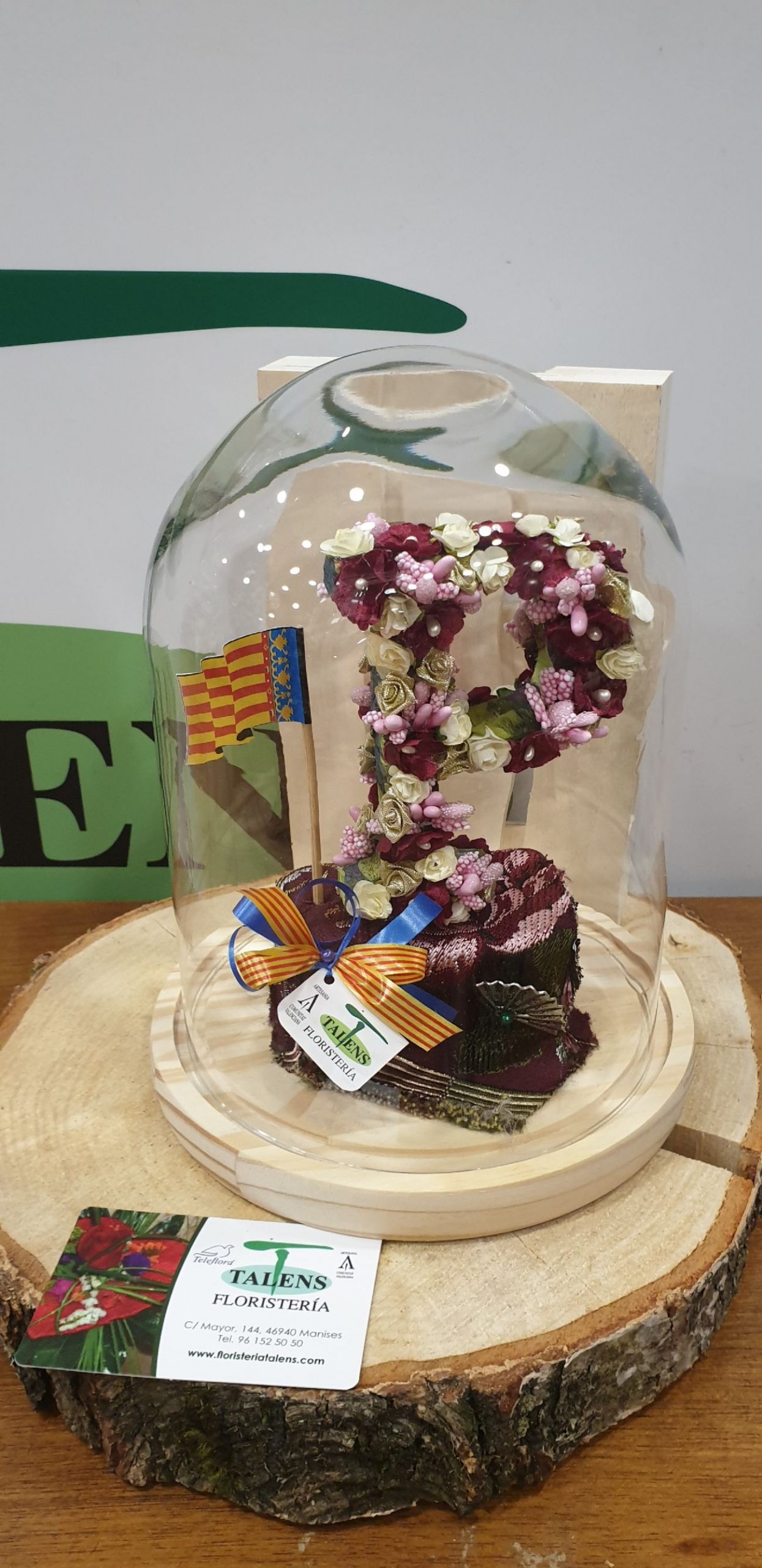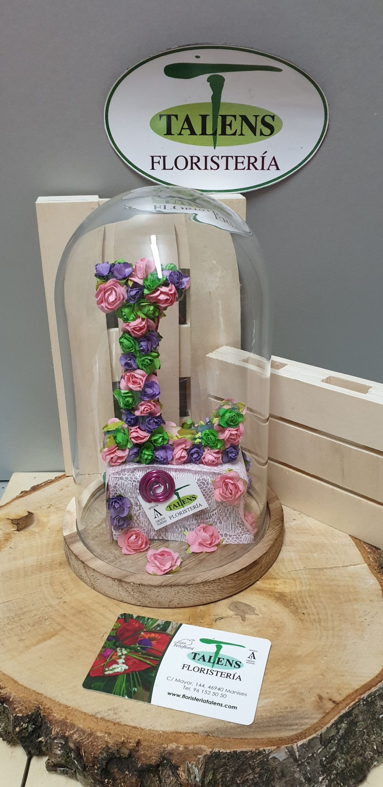 Urna decorada con la inicial deseada. Con flores de tela y preservadas, a dos caras. Pedido con una semana de antelación.