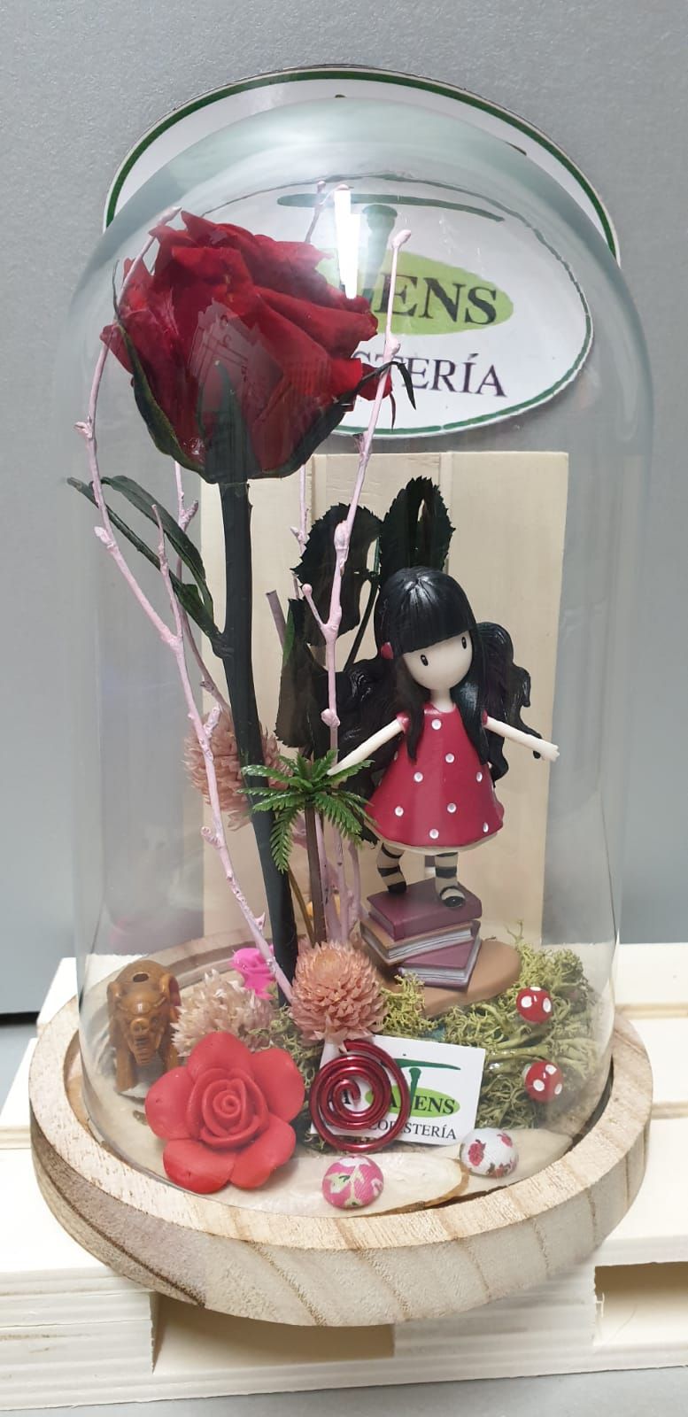 Urna con rosa preservada mas figura. Se puede elegir color de la rosa y la figura según disponibilidad en tienda.